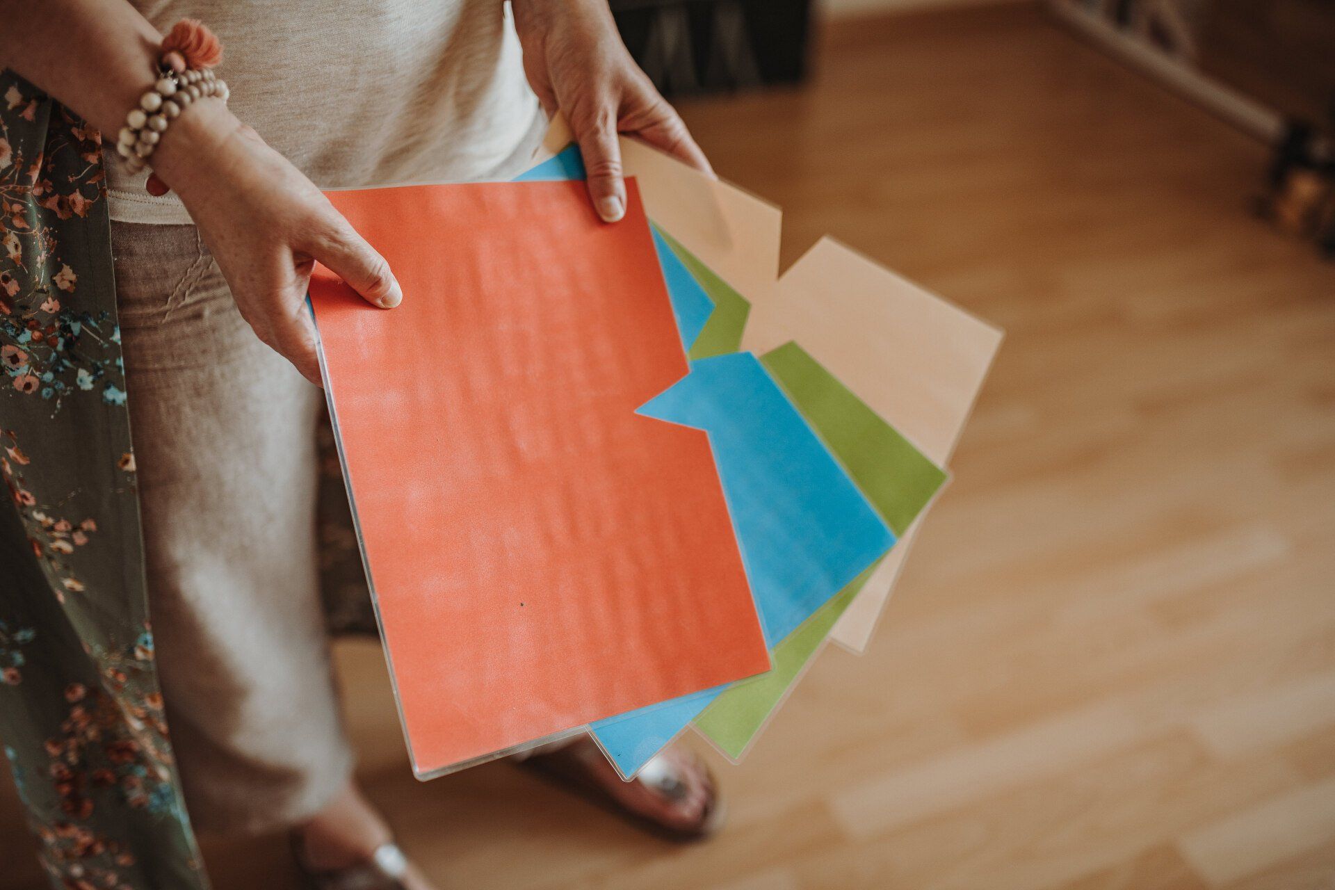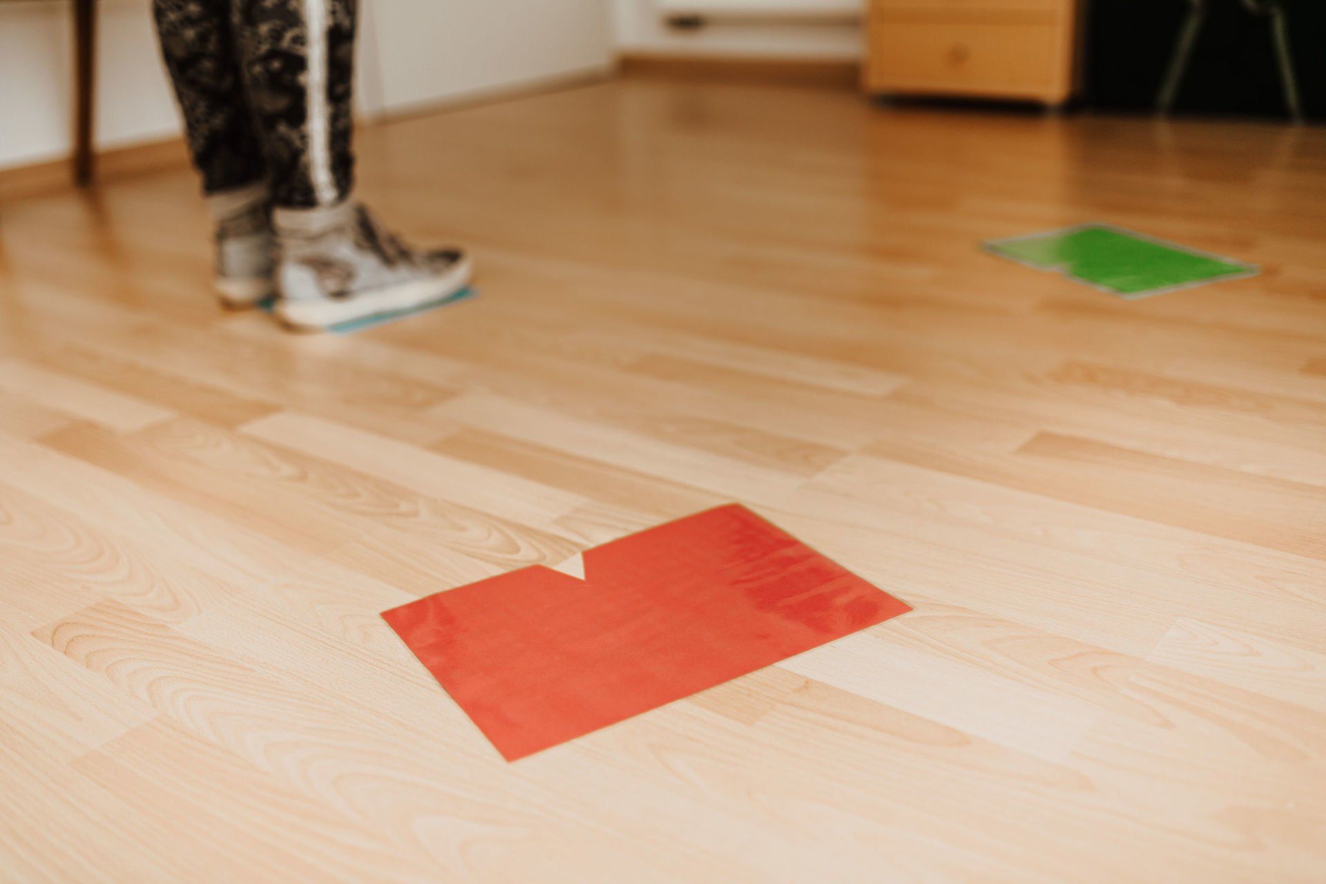 In der Einzelaufstellung arbeite ich mit „Bodenankern“ (Schablonen - siehe Foto unten) oder Figuren.